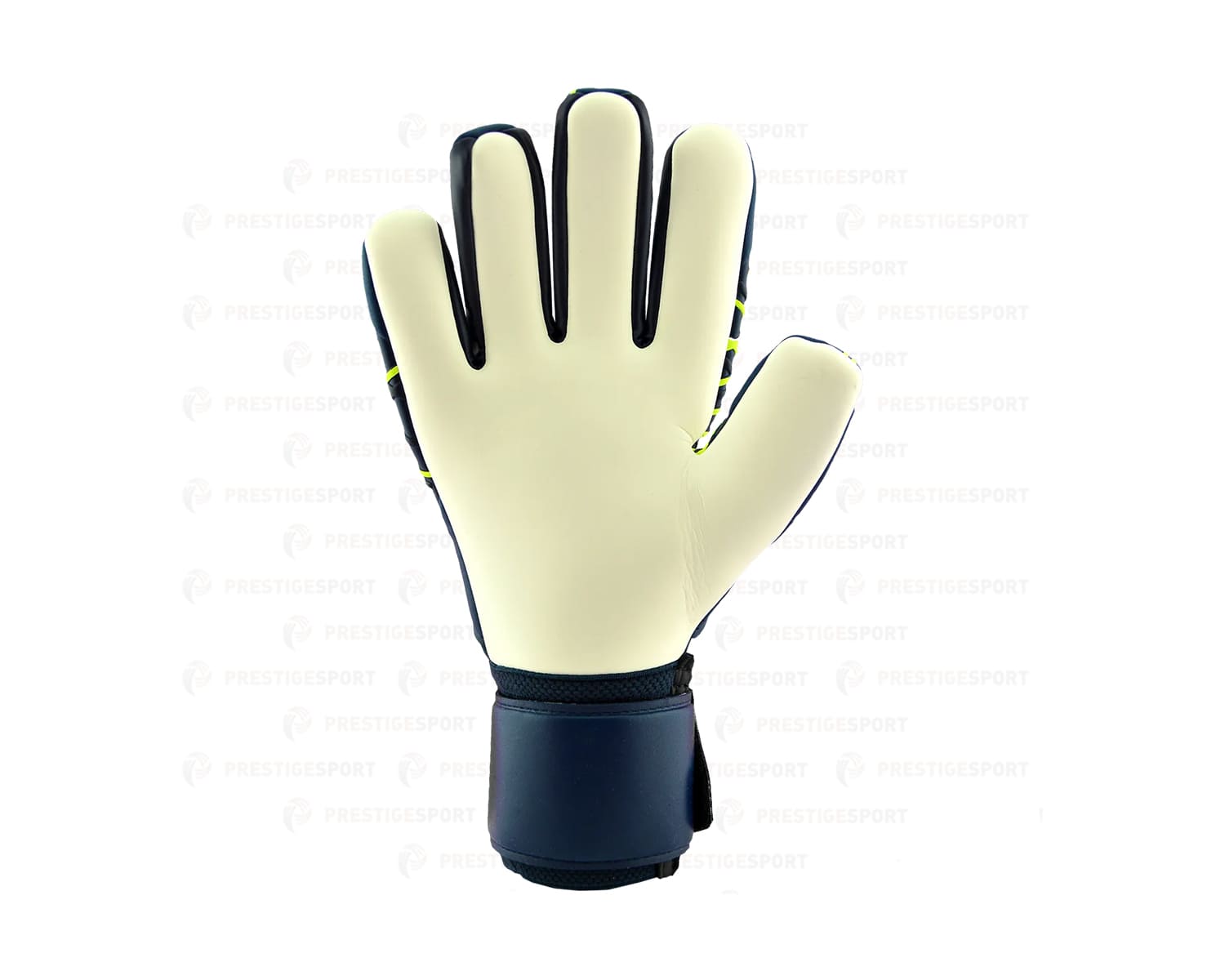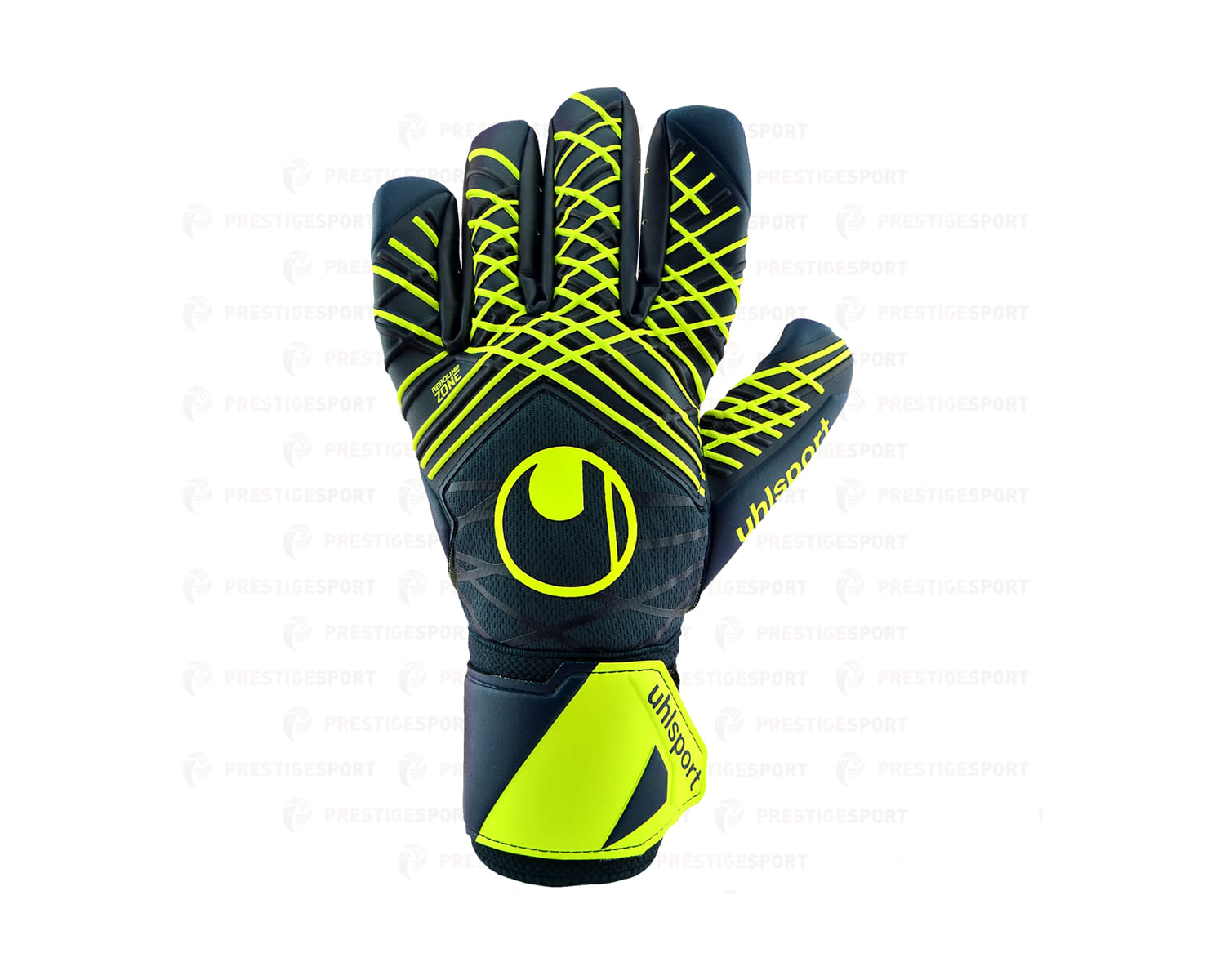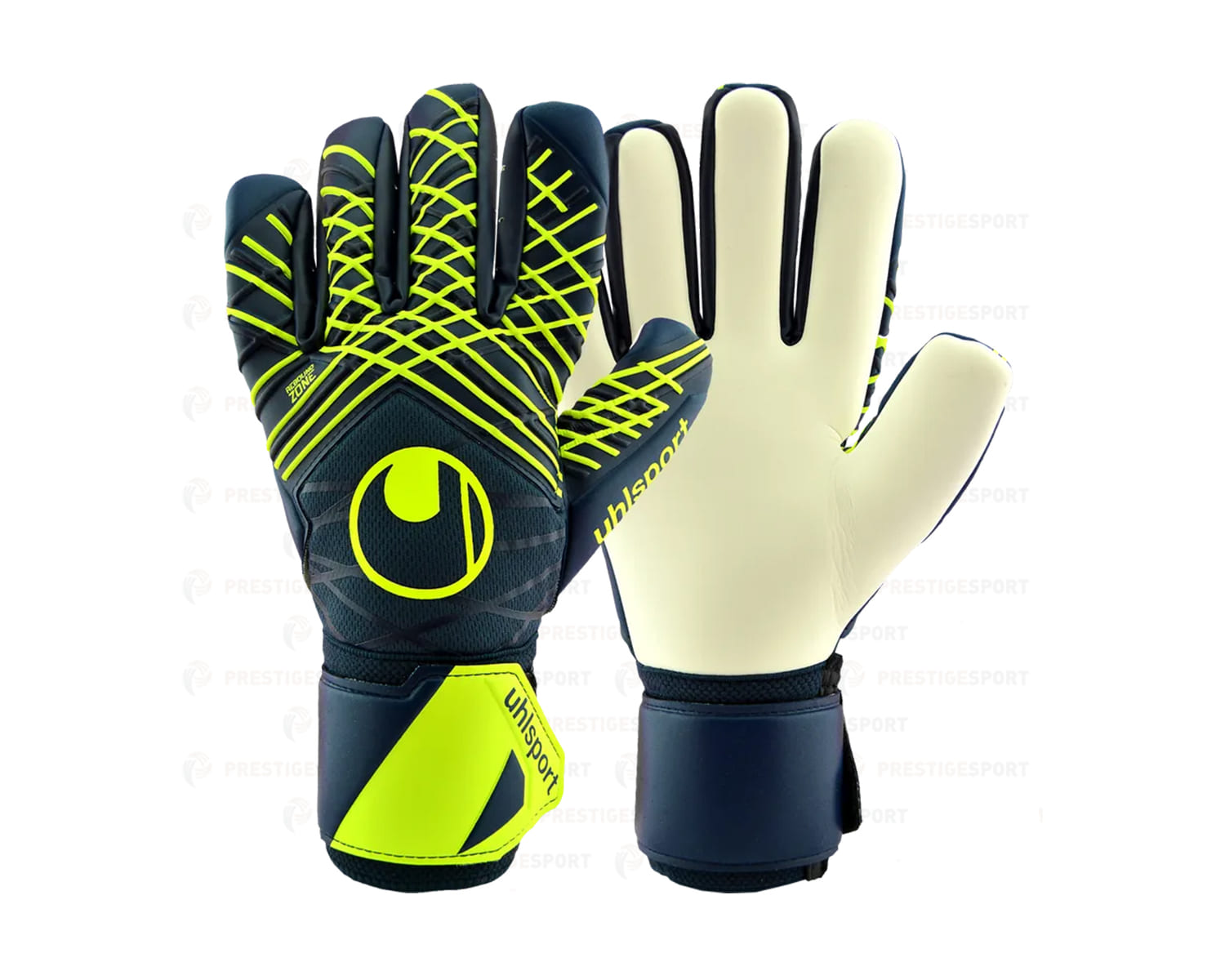 Guanti da portiere uhlsport Prediction Supersoft HN, colorazione blu navy e giallo fluo.
